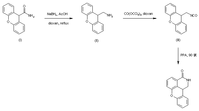 Reduction of 9-xanthencarboxamide (I) employing NaBH4 and acetic acid in boiling dioxan yielded the primary amine (II). This was treated with triphosgene to produce isocyanate (III). Finally, cyclization of the isocyanate (III) in hot polyphosphoric acid furnished the title tetracyclic system.