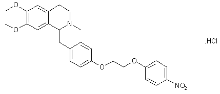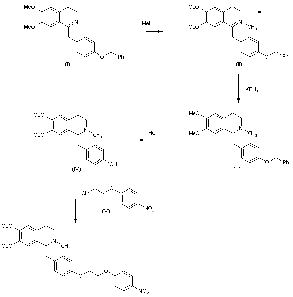The methylation of the 1-(4-benzyloxybenzyl)-6,7-dimethoxy-3,4-dihydroisoquinoline (I) with methyl iodide gives the isoquinolinium salt (II), which is reduced with potassium borohydride to afford 1-(4-benzyloxybenzyl)-6,7-dimethoxy-2-methyl-3,4-dihydroisoquinoline (III). The treatment of (III) with HCl yields the phenol (IV), which is finally alkylated with 2-(4-nitrophenoxy)ethanol.