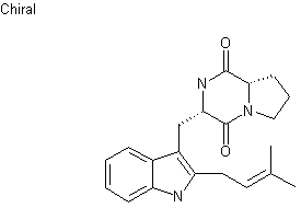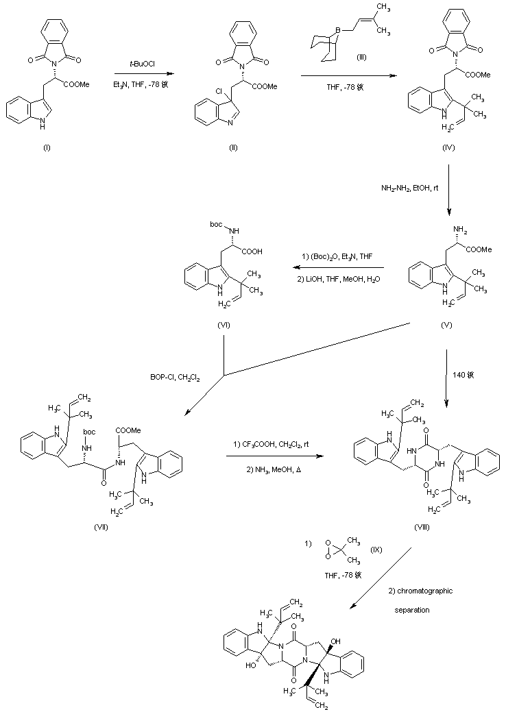 The compound was originally isolated from the fungal source N. gypsea var. incurvata. The synthesis of this compound was further described. Treatment of N-phthaloyltryptophan methyl ester (I) with tert-butyl hypochlorite and triethylamine at -78 C led to the formation of the intermediate 3-chloroindolenine (II), which was reacted with B-prenyl-9-BBN (III) to yield the 3-(1,1-dimethylpropenyl)indole (IV). Removal of the phthalimide protecting group of (IV) by hydrazinolysis provided aminoester (V). Protection of (V) as the tert-butyl carbamate, followed by ester hydrolysis with LiOH afforded the N-Boc-amino acid (VI). Coupling of protected amino acid (VI) with aminoester (V) by means of BOP-Cl gave dipeptide (VII). After removal of the Boc protecting group of (VII) with trifluoroacetic acid, ammonia-catalyzed cyclization provided diketopiperazine (VIII). Alternatively, diketopiperazine (VIII) was obtained by thermal cyclization of two molecules of aminoester (V) at 140 C. Oxidative cyclization by means of dimethyldioxirane (IX) produced a 1:1:2 mixture of syn:syn, anti:anti, and syn:anti diastereoisomeric heptacyclic compounds. Finally, the target syn:anti isomer was isolated by chromatography.