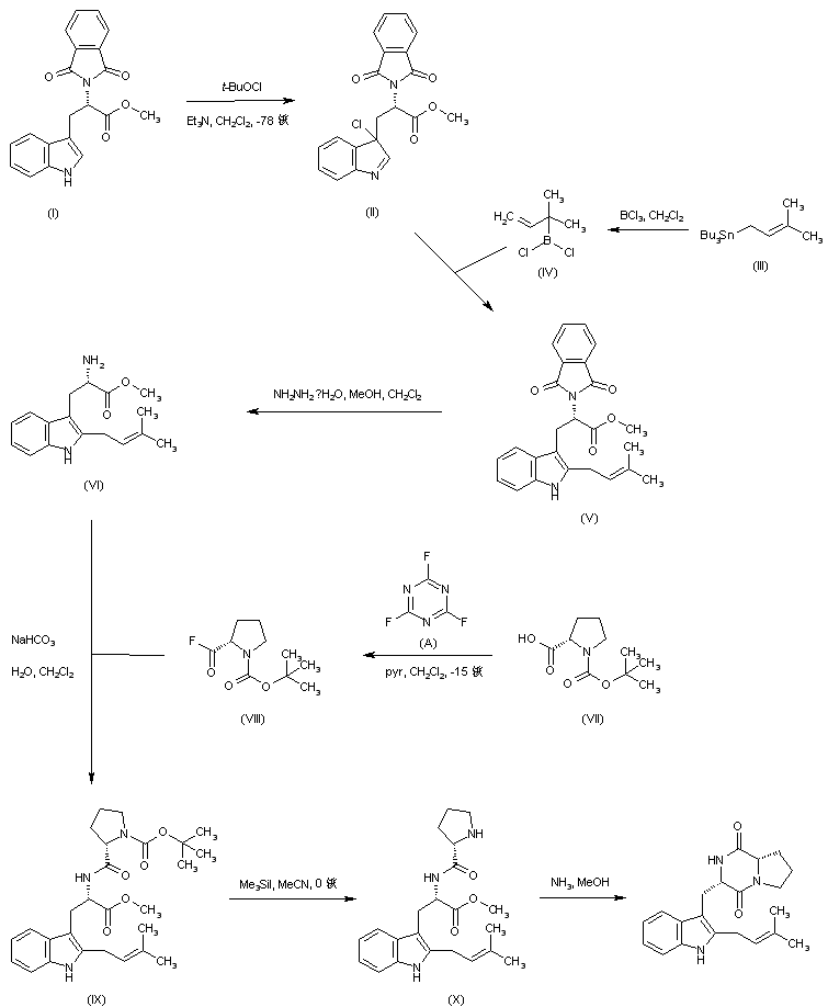 The compound was originally isolated from Aspergillus fumigatus. The synthesis of this compound was further described. Treatment of N-phthaloyltryptophan methyl ester (I) with tert-butyl hypochlorite and triethylamine at -78 C led to the formation of the intermediate 3-chloroindolenine (II). Reaction of tributyl prenyl stannane (III) with boron trichloride generated in situ the transient boron reagent (IV), which after condensation with chloroindolenine (II) produced the 3-prenylindole (V). Subsequent removal of the phthalimide protecting group of (V) by hydrazinolysis provided aminoester (VI). Coupling of (VI) with acid fluoride (VIII), (generated from N-Boc-L-proline (VII) and cyanuric fluoride), gave rise to amide (IX). The Boc protecting group of (IX) was cleaved employing iodotrimethylsilane, and the resulting aminoester (X) was then cyclized with methanolic ammonia to produce the target diketopiperazine.