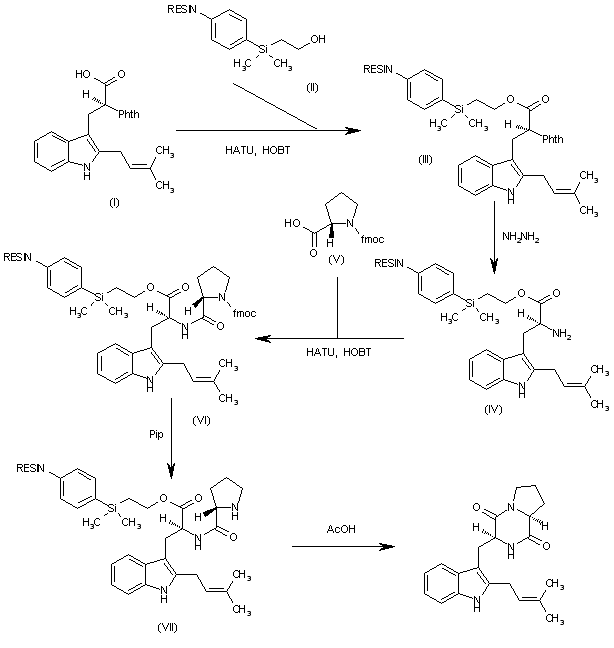The esterification of the silylated resin (II) with the prenyltryptophan derivative (I) by means of HATU, OBT and DIEA in DMF gives the resin-bonded ester (III), which is treated with hydrazine in methanol/dichloromethane to eliminate the protecting phthalimido group and yield the resin-bonded tryptophan ester derivative (IV). The condensation of (IV) with N-(Fmoc)-L-proline (V) by means of HATU, HOBT and DIEA in DMF affords the dipeptide (VI), which is treated with piperidine in N-methylpyrrolidine to eliminate the Fmoc protecting group and yield dipeptide ester (VII). Finally, this compound is submitted to an acid-induced cyclization by means of HOAc in refluxing methanol to afford the target bicyclic diketopiperazine.