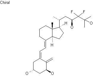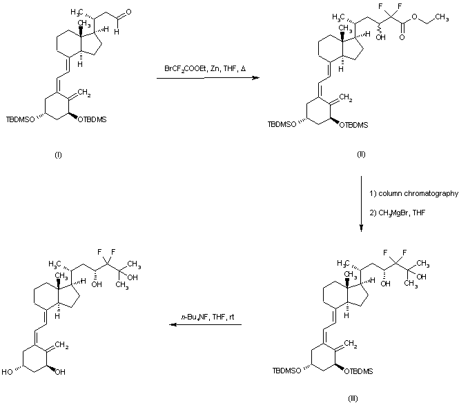 Aldehyde (I), derived from vitamin D2, was submitted to a Reformatsky reaction with ethyl bromodifluoroacetate and activated Zn to produce a mixture of diastereomeric b-hydroxyesters (II). After chromatographic separation, the required (23S)-isomer was condensed with MeMgBr to give tertiary alcohol (III). Finally, desilylation of (III) with tetra n-butylammonium fluoride in THF provided the title compound.