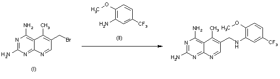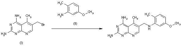 By condensation of bromomethyl derivative (I) with aniline (II).