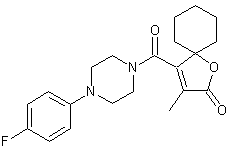 The condensation between cyclohexanone (I) and dimethyl itaconate (II) in the presence of NaOMe in cold Et2O afforded the spirobutenolide (III) together with some hydrolyzed product (IV). A further hydrolytic treatment with aqueous NaOH provided acid (IV), which was then converted to acid chloride (V) by treatment with PCl5 in refluxing cyclohexane. Reaction of this acid chloride with N-(4-fluorophenyl)piperazine in CH2Cl2 at 0 C produced the title amide.