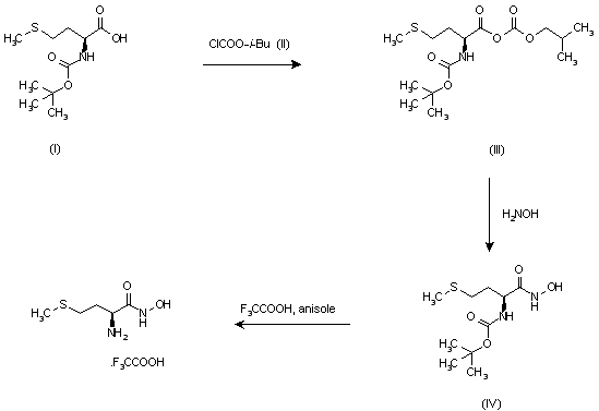 N-(tert-Butoxycarbonyl)-L-methionine (I) was converted to mixed anhydride (III) upon treatment with isobutyl chloroformate (II). Subsequent condensation of (III) with hydroxylamine gave hydroxamic acid (IV). Finally, the Boc group was cleared with trifluoroacetic acid in anisole to furnish the target methionine hydroxamate).