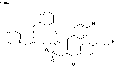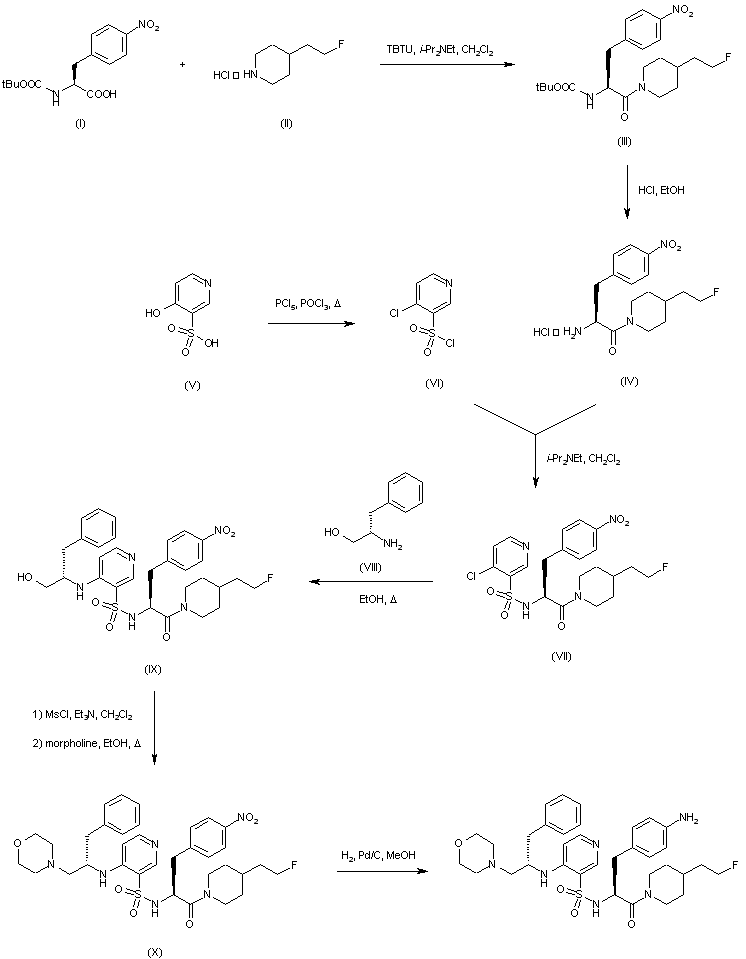 Coupling of N-Boc-p-nitrophenylalanine (I) with 4-(2-fluoroethyl)piperidine (II) by means of 2-benzotriazolyl-1,1,3,3-tetramethyluronium tetrafluoborate (TBTU) gave amide (III) which, after acidic deprotection provided aminoamide (IV). 4-Chloropyridine-3-sulfonyl chloride (VI), generated from 4-hydroxy pyridine-3-sulfonic acid (V) by chlorination with PCl5/POCl3, was coupled with amine (IV) to afford sulfonamide (VII). Further condensation of (VII) with L-phenylalaninol (VIII) produced aminopyridine (IX). Conversion of the alcohol group of (IX) to the corresponding mesylate, followed by displacement with morpholine furnished the N-substituted morpholine (X). The nitro group of (X) was finally reduced to the target aniline by hydrogenation over Pd/C.