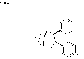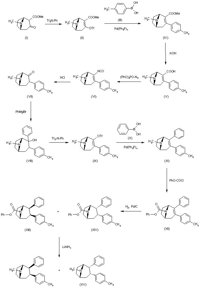 The reaction of tropanone (I) with N,N-bis(trifluoromethylsulfonyl)aniline and sodium hexamethyldisilylazide in THF gives the enol triflate (II), which is condensed with 4-methylphenylboronic acid (III) by means of palladium tetrakis(triphenylphosphine) yielding the p-tolyltropane (IV). The hydrolysis of the methyl ester of (IV) with KOH affords the carboxylic acid (V), which is treated with diphenoxyphosphoryl azide in hot toluene to give the isocyanate (VI). The hydrolysis of (VI) in refluxing ethanol yields the tropanone (VII). By reaction of the tropanone (VII) with N,N-bis(trifluoromethylsulfonyl)aniline to give the corresponding enol triflate (IX), which is then condensed with phenylboronic acid (X) by means of Pd(Ph3)4 to give (XI), which by reaction with phenyl chloroformate in dichloromethane yields the N-carboxylate (XII). The reduction of (XII) with H2 over Pd/C in methanol affords a mixture of the (exo, exo) (XIII) and (endo, endo) (XIV) compounds, which is reduced with LiAlH4 in ethyl ether providing a mixture of the target compound and its (endo, endo) isomer (XV) that is separated by chromatography.