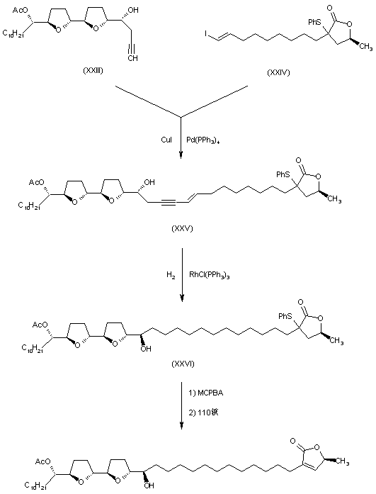 2) The reduction of (XIV) with DIBAL followed by protection with methoxymethyl chloride (MOM-Cl) yields the methoxymethyl ether (XV), which by regioselective dihydroxylation with AD-mix-beta, followed by mesylation with mesyl chloride affords the dimesylate (XVI). A new regioselective dihydroxylation of (XVI) with AD-mix-beta gives the diol (XVII), which is cyclized by treatment first with p-toluenesulfonic acid and then by heating at 140 C in pyridine yielding the bis(tetrahydrofuran) derivative (XVIII). The deprotection of (XVIII) with boron trilfuoride.ethearate, followed by tosylation with tosyl chloride in pyridine affords the tosylate (XIX), which is cyclized to the epoxide (XX) by reaction with K2CO3 in methanol. The acetylation of the secondary alcohol of (XIX) with acetic anhydride in pyridine affords the acetate (XXI), which is condensed with trimethylsilylacetylene (XXII) by means of n-BuLi in THF giving the acetylenic alcohol (XXIII).