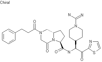 The condensation of 1-(benzyloxycarbonyl)piperidin-4-one with N-(tert-butoxycarbonyl)-2-phosphonoglycine trimethyl ester (II) by means of DBU in dichloromethane gives 2-[1-(benzyloxycarbonyl)piperidin-4-ylidene]-N-(tert-butoxycarbonyl)glycine methyl ester (III), which is selectively deprotected and reduced by hydrogenation with H2 over Pd/C in methanol yielding N-(tert-butoxycarbonyl)-2-(4-piperidyl)glycine methyl ester (IV). The reaction of (IV) with N,N'-di(tert-butoxycarbonyl)pyrazole-1-carboxamidine (V) by means of DIEA in dichloromethane gives the protected piperidine-1-carboxamidine (VI), which is treated with LiOH in methanol/water to obtain (VII) with a free carboxy group. The reaction of (VII) with O,N-dimethylhydroxylamine affords the hydroxamic ester (VIII), which is condensed with thiazole (IX) by means of butyllithium in THF yielding the fully protected intermediate (X). The deprotection of (X) with HCl in dioxane gives (XI) with free amino and amidino groups. The conddensation of (XI) with chiral acid (XII) by means of BOP and DIEA in acetonitrile yields amide (XIII) as a diastereomeric mixture that is resolved by preparative reverse-phase HPLC.