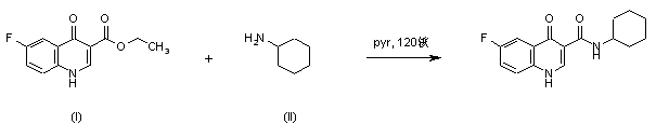 | 合成路线图解说明: Title compound was synthesized by condensation of ethyl 6-fluoro-4-quinolone-3-carboxylate (I) with cyclohexylamine (II) in pyridine at 120 C under pressure. |