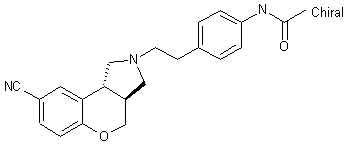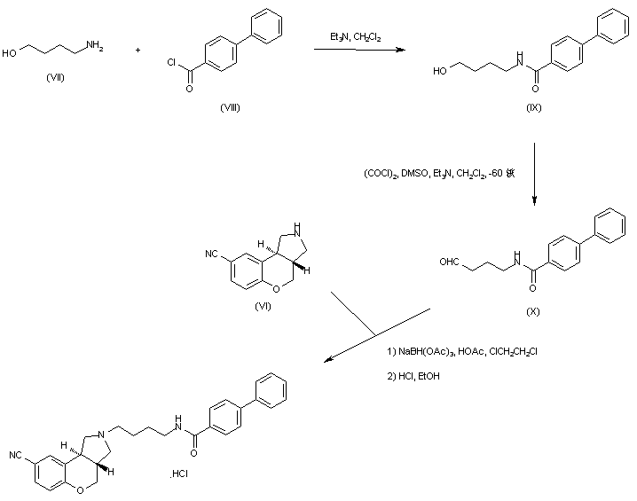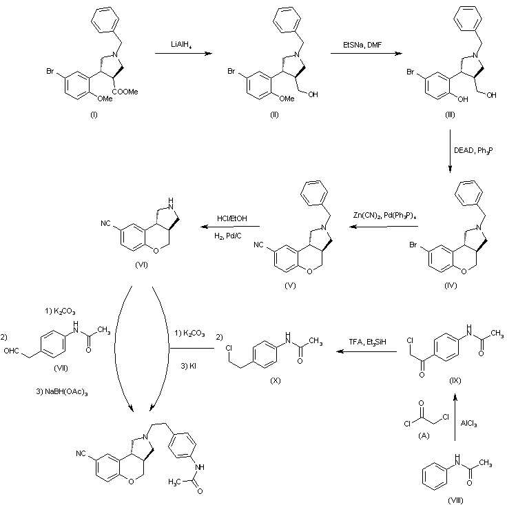 The reduction of the ester function of (I) with LiAlH4 in THF gives (II). O-demethylation of (II) with EtSNa in DMF yields alcohol (III), which is then cyclized by Mitsunobu reaction with DEAD稰h3P in THF to yield (IV). Displacement of the Br of (IV) by means of Zn(CN)2 and Pd(PPh3)4 in DMF affords cyano derivative (V), which is then converted into (VI) after debenzylation by treatment with HCl/EtOH and H2 over Pd/C. Finally (VI) is coupled with aldehyde (VII) by reductive amination in 1,2-dichloroethane in presence of NaBH(OAc)3. Alternatively the final product can be obtained by reaction of (VI) with chloro derivative (X) in CH3CN in presence of K2CO3 and KI. (X) can be obtained by acylation of acetanilide (VIII) with chloride (A) in 1,2-dichloroethane in presence of AlCl3 followed by treatment with TFA and Et3SiH.