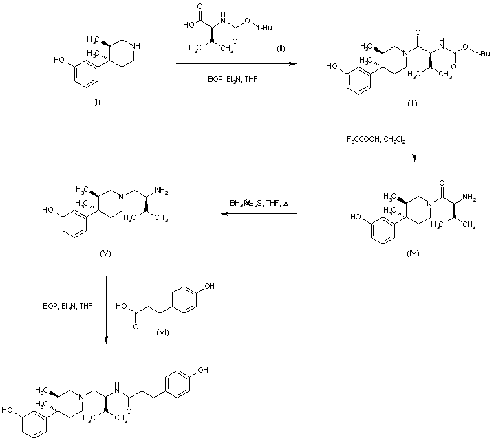 Coupling of (3R,4R)-dimethyl-4-(3-hydroxyphenyl)piperidine (I) with N-Boc-L-valine (II) using benzotriazolyloxy-tris(dimethylamino)phosphonium hexafluorophosphate (BOP) provided amide (III). After deprotection of the Boc group of (III) with trifluoroacetic acid, the resulting valyl amide (IV) was reduced with BH3-Me2S to afford diamine (V). Finally, coupling of (V) with 3-(4-hydroxyphenyl)propionic acid (VI) in the presence of BOP yielded the target compound.