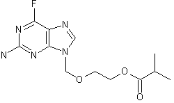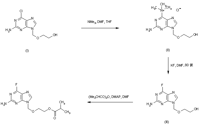 Treatment of the 6-chloropurine (I) with trimethylamine in DMF-THF produced the intermediate ammonium salt (II), which was displaced by KF in DMF at 80 C to afford fluoride (III). Finally, esterification of (III) with isobutyric anhydride in the presence of DMAP yielded the title isobutyrate ester.