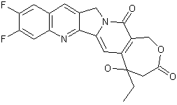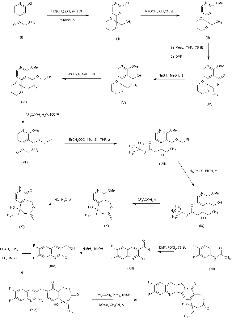 2-Chloro-4-propionylpyridine (I) was protected as the cyclic ketal (II) with 1,3-propanediol and p-toluenesulfonic acid in refluxing toluene with azeotropical removal of water. Subsequent halogen displacement in (II) with sodium methoxide in boiling acetonitrile gave methoxypyridine (III). Lithiation of (III) with mesityllithium, followed by condensation with dimethylformamide provided formylpyridine (IV), which was reduced to alcohol (V) using NaBH4 in MeOH. The hydroxyl group of (V) was protected as the benzyl ether (VI), and the ketal group was then hydrolyzed to ketone (VII) with aqueous trifluoroacetic acid. Reformatskii reaction of (VII) with tert-butyl bromoacetate and zinc afforded the beta-hydroxyester (VIII). Further hydrogenolysis of benzyl ether of (VIII) over Pd/C gave alcohol (IX). Then, treatment of (IX) with trifluoroacetic acid produced lactone (X), and hydrolysis of the methoxy group of (X) with aqueous HCl furnished pyridone (XI). Condensation of 3,4-difluoroacetanilide (XII) with Vilsmeier reagent yielded quinolinecarboxaldehyde (XIII), which was reduced to alcohol (XIV) with NaBH4. This was then coupled with pyridone (XI) under Mitsunobu conditions to give (XV). Finally, Heck reaction of (XV) with palladium acetate and triphenyl phosphine generated the target pentacyclic compound.