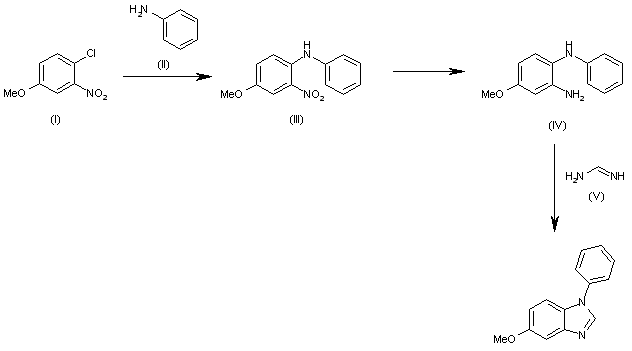 The reaction of 2-chloro-5-methoxynitrobenzene (I) with aniline (II) in basic medium gives the diphenylamine (III), which is reduced at the NO2 group with H2 over Pd/C in methanol yielding the o-phenylenediamine (IV). Finally, this compoud is cyclized with formamidine (V) in refluxing 2-methoxyethanol.