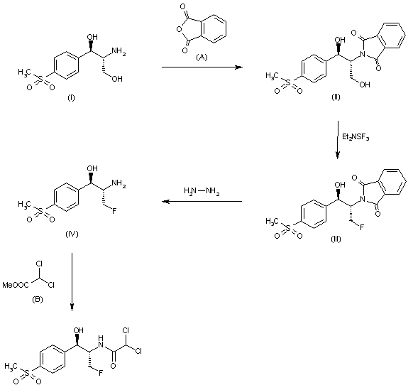 The D-(threo)-1-p-substituted-phenyl-2-dichloroacetamido-3-fluoro-1-propanol derivatives were prepared according to the following reaction sequence: The amino group of (I) was protected with phthalicanhydride (II), followed by substitution of the primary hydroxy group with diethylamine - sulfur-trifluoride to (III), deprotection with hydrazine to the amine (IV) and acetylation with methyldichloro-acetate (B) to the target compounds.