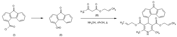 Fluorenone-4-carboxaldehyde (II) was obtained by reduction of acid chloride (I). Subsequent Hantzsch synthesis using allyl acetoacetate (III) and ammonium hydroxide in boiling isopropyl alcohol provided the title dihydropyridine.