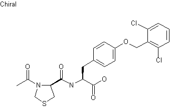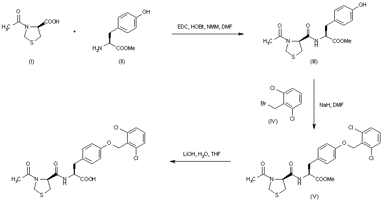 Coupling of N-acetyl-D-thioproline (I) with tyrosine methyl ester (II) using EDC and HOBt yielded dipeptide (III). Subsequent alkylation of the tyrosine phenolic group of (III) with 2,6-dichlorobenzyl bromide (IV) and NaH produced the dichlorobenzyl ether (V). The methyl ester group of (V) was finally hydrolyzed employing LiOH in aqueous THF.
