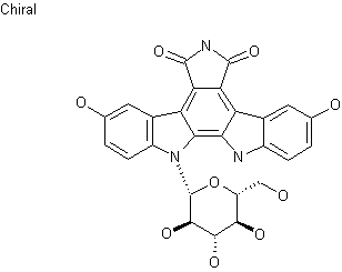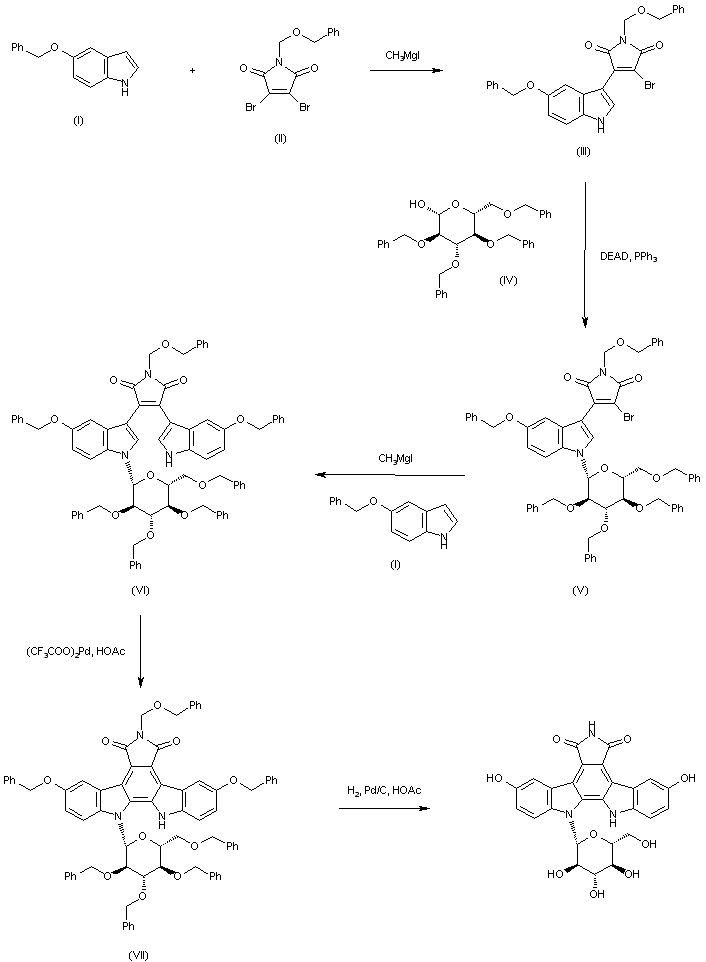 Condensation of the magnesium iodide salt of 5-(benzyloxy)indole (I) with N-(benzyloxymethyl)-3,4-dibromomaleimide (II) provided the monoindolyl maleimide (III). Coupling of (III) with the benzyl-protected glucose (IV) via Mitsunobu reaction afforded the glycosylated indole (V). A second indolyl group was then introduced in (V) to give the bisindolylmaleimide (VI), which was oxidatively cyclized to the indolocarbazole (VII) using palladium bis(trifluoroacetate). Finally, hydrogenolysis of the benzyl protecting groups of (VII) over Pd/C furnished the title compound.