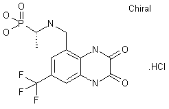 The reaction of 2-methyl-4-(trifluoromethyl)aniline (I) with ethoxalyl chloride (II) by means of triethylamine in ethyl acetate gives the oxamic ester (III), which is nitrated at the aromatic ring with KNO3 and H2SO4 yielding the intermediate (IV). The reductocyclization of (IV) by means of TiCl3 in acetone affords the quinoxalinedione (V), which is treated with PCl5 in refluxing POCl3 affording the dichloroquinoxaline (VI). The reaction of (VI) with sodium methoxide in refluxing methanol gives the dimethoxyquinoxaline (VII), which is brominated with NBS and AIBN in refluxing benzene yielding the bromomethyl quinoxaline (VIII). The condensation of (VIII) with dimethyl 1(S)-aminoethylphosphonate (IX) by means of NaHCO3 in DMF affords the phosphonate derivative (X), which is finally submitted to acid hydrolysis to provide the target compound.