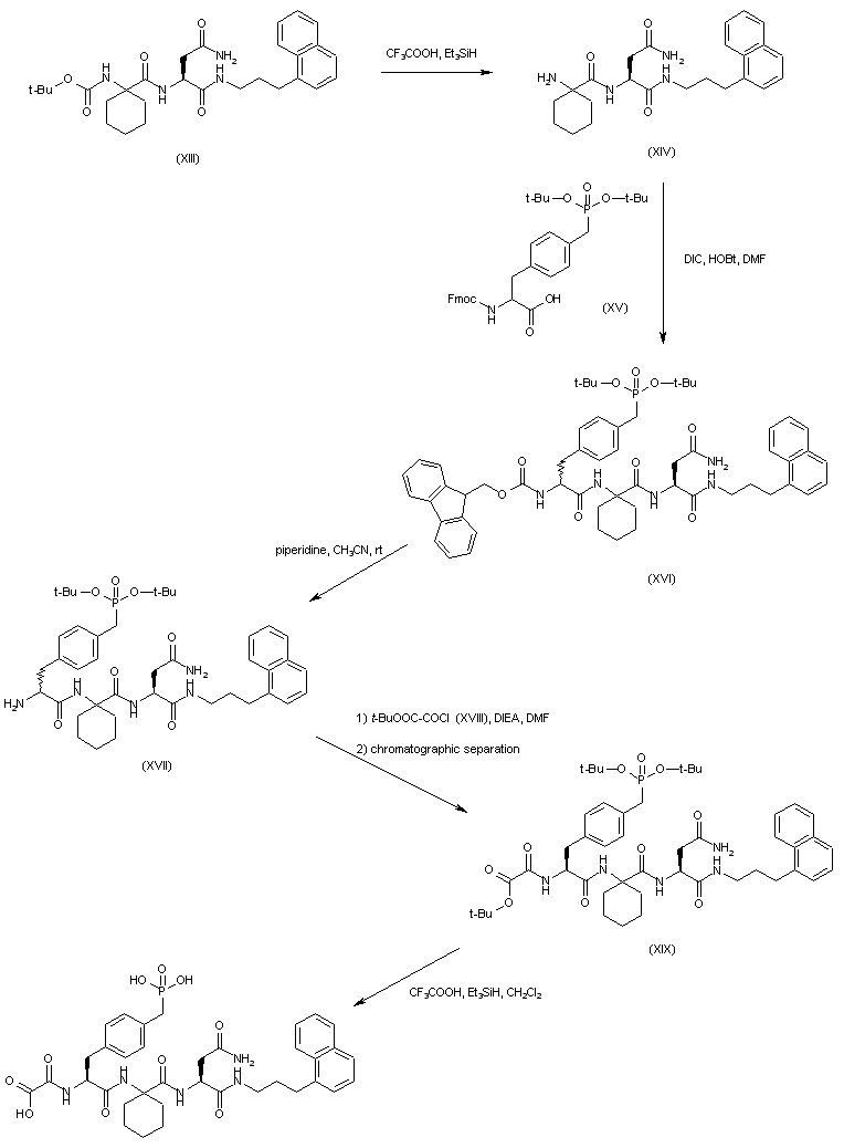 The deprotection of (XIII) with trifluoroacetic acid in the presence of triethyl silane provided dipeptide amide (XIV). This was then coupled with the racemic (phosphonomethyl)phenylalanine derivative (XV) using diisopropyl carbodiimide (DIC) and HOBt to yield tripeptide (XVI) as a diastereomeric mixture. The Fmoc group of (XVI) was deprotected with piperidine in acetonitrile, and the resulting amine (XVII) was then coupled with tert-butyl oxalyl chloride (XVIII) to afford (XIX). After chromatographic isolation of the required L,L-diastereoisomer of (XIX), treatment with trifluoroacetic acid cleaved the tert-butyl groups to furnish the title compound.