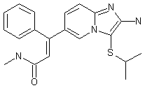 Friedel-Crafts acylation of benzene with 6-chloronicotinyl chloride (I) using AlCl3 afforded ketone (II). Subsequent displacement of the chlorine atom of (II) by means of ethanolic ammonia at 145 C in a pressure reactor led to the aminopyridine (III), which was converted to sulfonamide (IV) by means of tosyl chloride in pyridine. Alkylation of the pyridine N of (IV) with iodoacetamide gave (V), and further cyclization in the presence of trifluoroacetic anhydride produced the imidazopyridine (VI). Phosphonate (VIII) was prepared by treatment of triethyl phosphonoacetate (VII) with methylamine. Horner-Emmons condensation of this phosphonate with ketone (VI) yielded the E-propenamide (IX). Selective iodination of (IX) at position 3 using N-iodosuccinimide furnished iodide (X). This compound was first deprotonated with PhLi, then subjected to a halogen-metal exchange reaction with tert-butyllithium, and the resulting trianion was reacted with isopropyl isopropanethiolsulfonate to give sulfide (XI). Finally, smooth hydrolysis of the trifluoroacetamide group of (XI) employing MeOH-CH2Cl2 in the presence of silica gel provided the title compound.