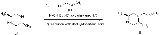 | 合成路线图解说明: The alkylation of the prochiral trans-2,5-dimethylpiperazine (I) with allyl bromide (II) produced a racemic mixture of N-allyl piperazines. After separation of the (+)-isomer by precipitation with (+)-camphoric acid, the desired (-)-piperazine (III) was isolated from the remaining enriched mixture by crystallization as the di-p-toluoyl-D-tartrate salt. |