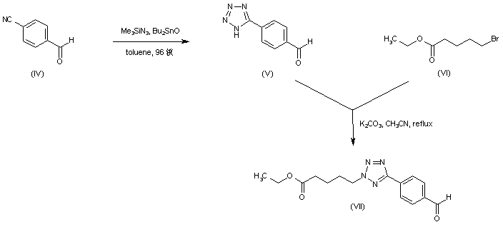 | 合成路线图解说明: 4-Formylbenzonitrile (IV) was converted to the aryl tetrazole (V) upon treatment with trimethylsilyl azide and dibutyltin oxide. Regioselective alkylation of tetrazole (V) with ethyl 5-bromovalerate (VI) afforded the (2-tetrazolyl)pentanoate (VII). |