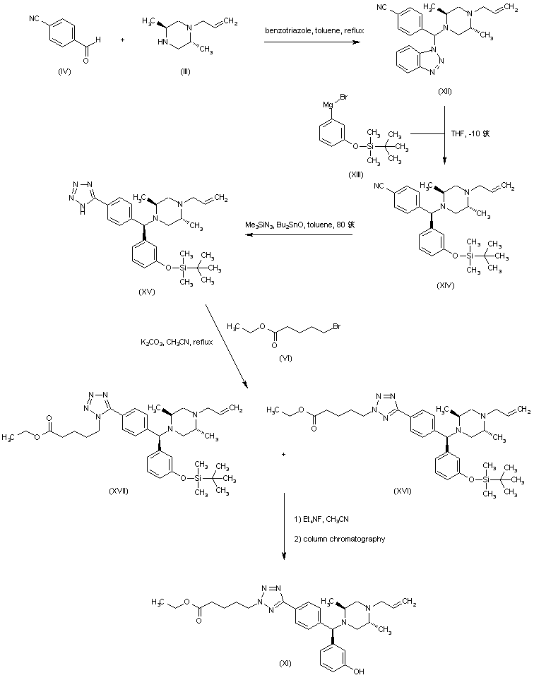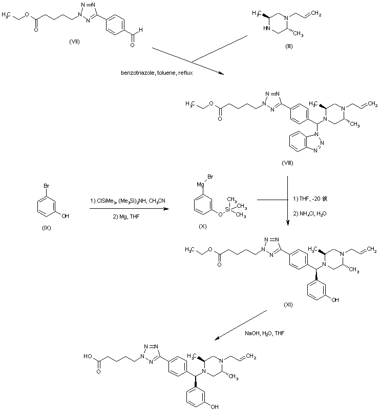 | 合成路线图解说明: The condensation between aldehyde (VII), piperazine (III) and benzotriazole furnished adduct (VIII). The Grignard reagent (X), prepared by silylation of 3-bromophenol (IX) followed by reaction with Mg, was then condensed with the benzotriazolyl adduct (VIII) to give the (diarylmethyl)piperazine (XI). Finally, basic hydrolysis of the ethyl ester of (XI) yielded the title compound. |
