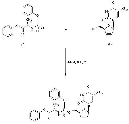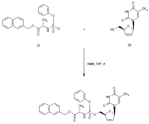 Title phosphoramidate was obtained by condensation of phenyl [(2-naphthylmethoxy)alanino]phosphorochloridate (I) with 2',3'-dideoxy-2',3'-didehydrothymidine (II) in the presence of N-methylmorpholine in THF at r.t.
