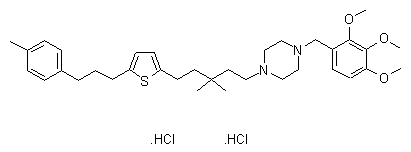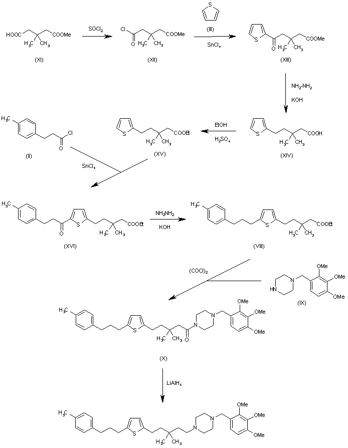 The reaction of 3-(4-methylphenyl)propionic acid (I) with SOCl2 gives the corresponding acyl chloride (II), which is condensed with thiophene (III) by means SnCl4 yielding 3-(4-methylphenyl)-1-(2-thienyl)propan-1-one (IV). The reduction of (IV) with hydrazine and KOH in hot triethylene glycol affords 2-[3-(4-methylphenyl)propyl]thiophene (V), which is condensed with 3,3-dimethyl glutaric anhydride (VI), by means of AlCl3 in hot nitrobenzene giving the 5-oxopentanoic acid derivative (VII). The reduction of (VII) with hydrazine and KOH as before yields the pentanoic acid derivative (VIII), which is condensed with 4-(2,3,4-trimethoxybenzyl)piperazine (IX) by means of oxalyl chloride to afford the acyl piperazine (X). Finally, the amide group of (X) is reduced with LiAlH4 in ethyl ether.