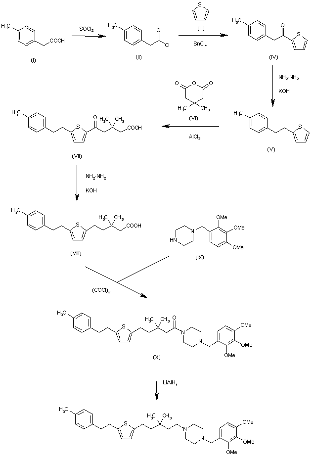 The reaction of 2-(4-methylphenyl)acetic acid (I) with SOCl2 gives the corresponding acyl chloride (II), which is condensed with thiophene (III) by means SnCl4 yielding 2-(4-methylphenyl)-1-(2-thienyl)ethanone (IV). The reduction of (IV) with hydrazine and KOH in hot triethylene glycol affords 2-[2-(4-methylphenyl)ethyl]thiophene (V), which is condensed with 3,3-dimethylglutaric anhydride (VI), by means of AlCl3 in hot nitrobenzene giving the 5-oxopentanoic acid derivative (VII). The reduction of (VII) with hydrazine and KOH as before yields the pentanoic acid derivative (VIII), which is condensed with 4-(2,3,4-trimethoxybenzyl)piperazine (IX) by means of oxalyl chloride to afford the acyl piperazine (X). Finally, the amide group of (X) is reduced with LiAlH4 in ethyl ether.
