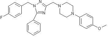 The condensation of 1-(4-methoxyphenyl)piperazine (I) with ethyl chloroacetate (II) gives the expected condensation product (III), which by treatment with hydrazine in converted into the corresponding hydrazide (IV). The cyclization of (IV) with 4-methylbenzimidate (V) by heating at 180 C affords the triazole (VI), which is finally condensed with 4-fluorobenzyl chloride (VII) by means of NaH in DMF.