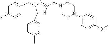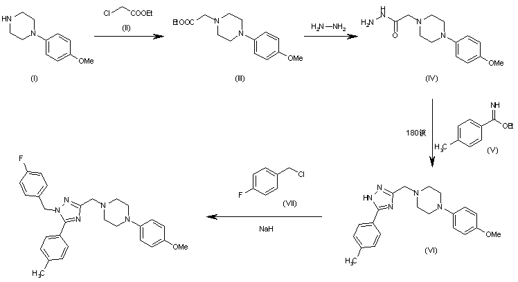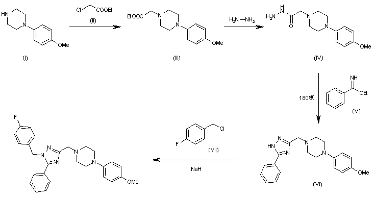 The condensation of 1-(4-methoxyphenyl)piperazine (I) with ethyl chloroacetate (II) gives the expected condensation product (III), which by treatment with hydrazine in converted into the corresponding hydrazide (IV). The cyclization of (IV) with 4-methylbenzimidate (V) by heating at 180 C affords the triazole (VI), which is finally condensed with 4-fluorobenzyl chloride (VII) by means of NaH in DMF.