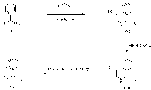 In a different method, amine (I) was alkylated with 2-bromoethanol (V) to give the N-(hydroxyethyl) amine (VI), which was further converted to bromo amine (VII) by treatment with concentrated HBr. Friedel-Crafts cyclization of (VII) upon heating in the presence of AlCl3 furnished tetrahydroisoquinoline (IV).