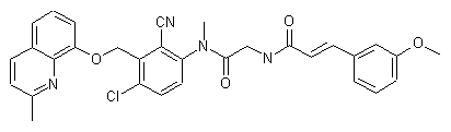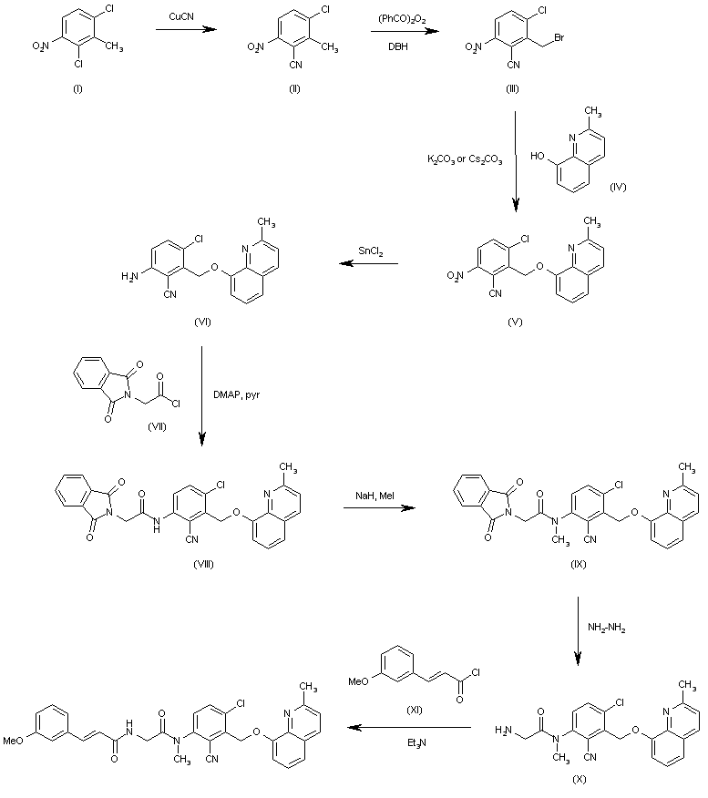 The reaction of 2,6-dichloro-3-nitrotoluene (I) with CuCN in hot DMF gives the benzonitrile (II), which is brominated with 1,3-dibromo-5,5-dimethylhidantoin (DBDH) and benzoyl peroxide in hot chlorobenzene yielding the benzyl bromide (III). The reaction of (III) with 2-methyl-8-quinolinol (IV) by means of K2CO3 or Cs2CO3 in DMF affords the benzyl ether (V), which is reduced at the nitro group with SnCl2 giving the amino derivative (VI). The condensation of (VI) with 2-phthalimidoacetyl chloride (VII) by means of DMAP and pyridine in refluxing dichloromethane yields the corresponding amide (VIII), which is N-methylated with methyl iodide and NaH in DMF affording intermediate (IX). Elimination of the phthalimido group of (IX) with hydrazine in refluxing dichloromethane/methanol provides the substituted glycinamide (X), which is finally acylated with 3-(3-methoxyphenyl)-2(E)-propenoyl chloride (XI) by means of triethylamine in refluxing dichloromethane.