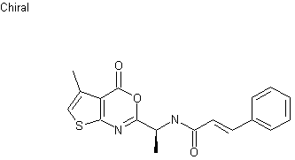 The cyclization of 2-amino-4-methylthiophene-3-carboxylic acid (I) with N-(tert-butoxycarbonyl)-L-alanine (II), by means of 1-[3-(dimethylamino)propyl]-3-ethylcarbodiimide (DEC) and HOBT in DMF gives the protected thienooxazinone (III), which is deprotected with trifluoroacetic acid in dichloro methane yielding 2-(1(S)-aminoethyl)-5-methyl-4H-thieno[2,3-d][1,3]oxazin-4-one (IV). Finally, this compound is acylated with 4-oxo-4-phenyl-2(E)-butenoic acid (VI) by means of DEC and diisopropylethylamine in DMF.