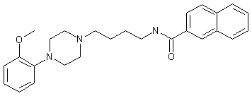 N-(2-Methoxyphenyl)piperazine (I) was alkylated with 4-bromobutyronitrile (II) to provide the 3-cyanopropylpiperazine (III). Subsequent reduction of the cyano group of (III) using LiAlH4 produced the primary amine (IV). The title amide was then obtained by condensation of (IV) with 2-naphthoic acid (V) after activation as the corresponding acid chloride with (COCl)2 or as the mixed anhydride with isobutyl chloroformate.