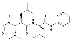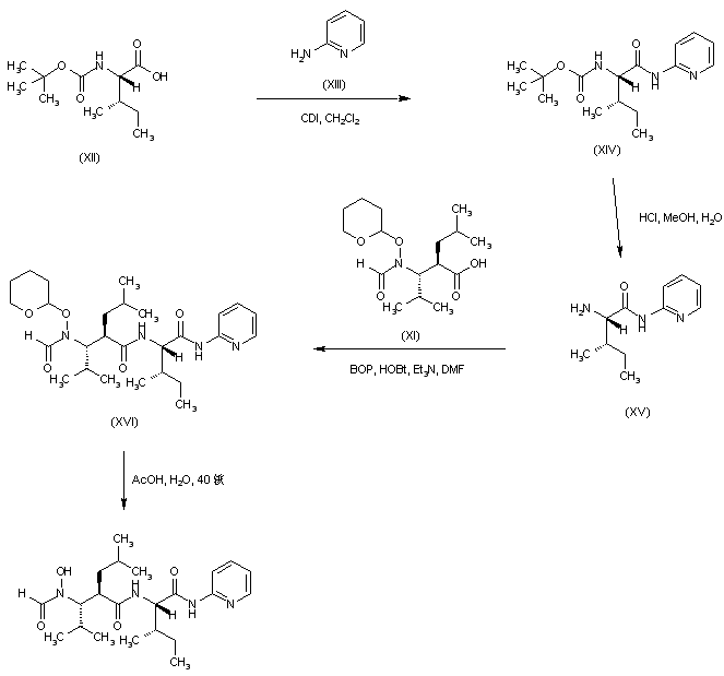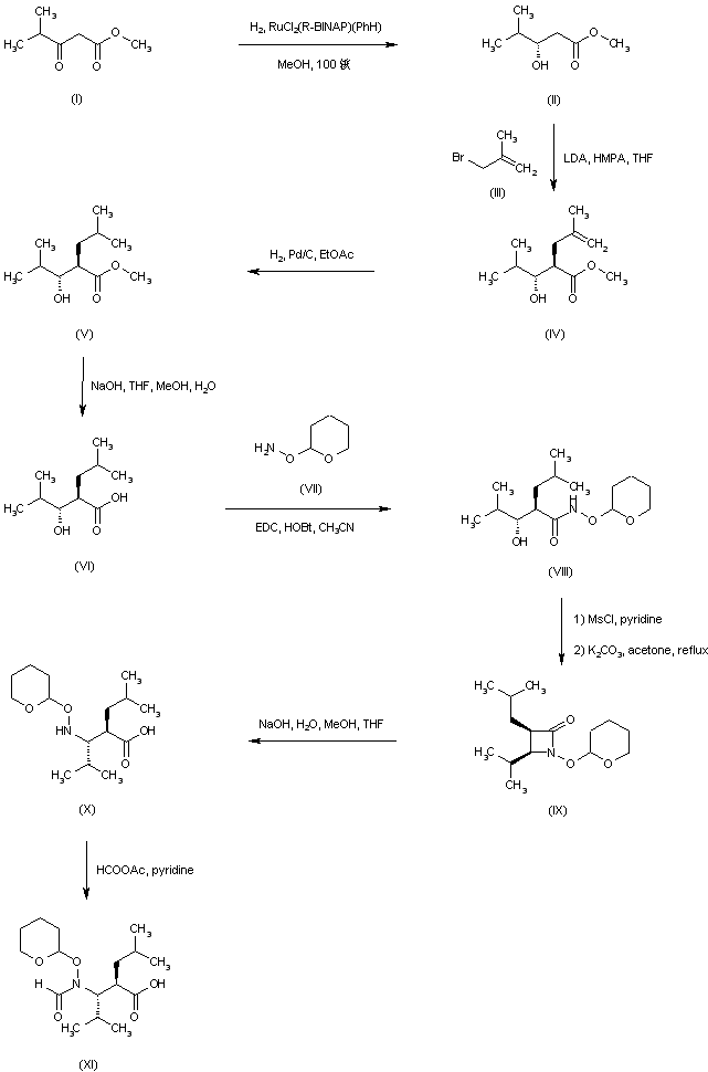 Catalytic hydrogenation of methyl isobutyrylacetate (I) in the presence of chiral ruthenium catalyst afforded the (S)-hydroxy ester (II). Subsequent alkylation of the lithium enolate of (II) with 3-bromo-2-methyl-1-propene (III) proceeded with diastereoselectivity, yielding (IV). The olefin double bond of (IV) was then hydrogenated over Pd/C to provide the saturated compound (V). After basic hydrolysis of the methyl ester group of (V), the resultant carboxylic acid (VI) was coupled to O-tetrahydropyranylhydroxylamine (VII) to furnish the tetrahydropyranyl-protected hydroxamate (VIII). Conversion of (VIII) into the corresponding mesylate, followed by cyclization under basic conditions, gave rise to the azetidinone (IX). Further azetidinone ring opening under conditions of basic hydrolysis generated the N-hydroxyaminoacid derivative (X). This was converted to the formamide (XI) upon treatment with formic acetic anhydride in pyridine.