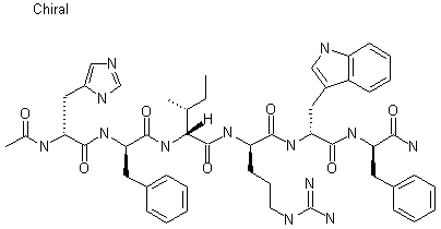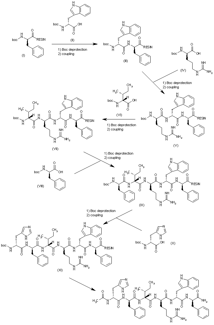 This peptide has been obtained by by the usual method of solid phase resin starting from N-Boc-protected D-phenylalanine coupled to a methylbenzhydryl amine polystyrene resin (I) by successive cycles of Boc deprotection and coupling. The amino acid used were successively, N-Boc-D-tryptophan (II), N-Boc-D-arginine (IV), N-Boc-D-isoleucine (VI), N-Boc-D-phenylalanine (VIII) and N-Boc-D-histidine (X), yielding the intermediate peptide-resins (III), (V), (VII), (IX), and (XI). Finally, this last intermediate was deprotected and cleaved from the resin with HF, acetylated at the N-terminus and amidated at the C-terminus using standard methods.