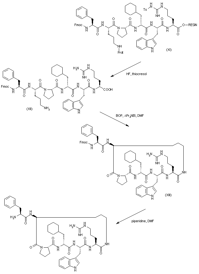 Cleavage from the resin (XI) using anhydrous HF in the presence of thiocresol furnished the linear peptide (XII). This was cyclized employing BOP and diisopropylethylamine in DMF to give the cyclic peptide (XIII). The Fmoc group of (XIII) was finally deprotected by means of piperidine in DMF.