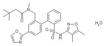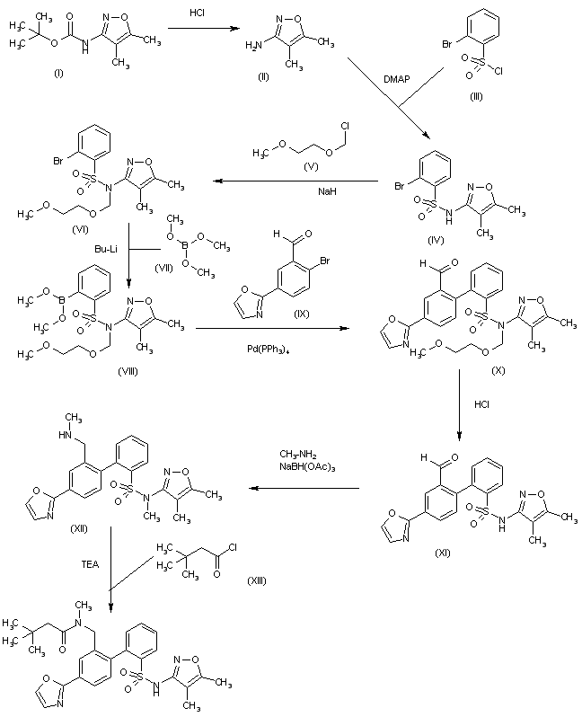 The hydrolysis of N-(4,5-dimethyl-3-isoxazolyl)carbamic acid tert-butyl ester (I) with HCl in dioxane gives the corresponding amine (II), which is condensed with 2-bromophenylsulfonyl chloride (III) by means of DMAP in pyridine to yield the sulfonamide (IV). The alkylation of (I) with 2-methoxyethoxymethyl chloride (V) and NaH in DMF affords the N,N-disubstituted sulfonamide (VI), which is treated with trimethyl borate (VII) and BuLi in THF to provide the boronate (VIII). The condensation of (VIII) with 2-bromo-5-(2-oxazolyl)benzaldehyde (IX) by means of palladium tetrakis(triphenylphosphine) in hot toluene/ethanol gives the biphenyl derivative (X), which is deprotected by means of HCl in refluxing ethanol/water to yield the sulfonamide (XI). The reductive amination of (XI) with methylamine and NaBH(OAc)3 in dichloromethane/HOAc affords the secondary amine (XII), which is finally acylated with 3,3-dimethylbutyryl chloride and TEA in dichloromethane to furnish the target diamide.