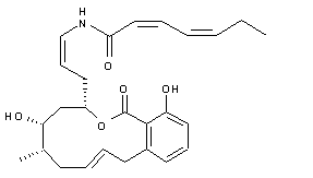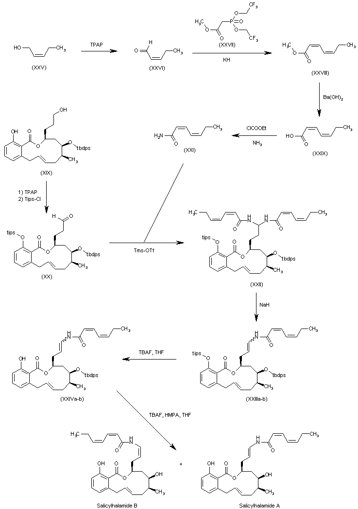 The oxidation of the primary alcohol of (XIX) with TPAP and NMO in dichloromethane gives the corresponding aldehyde (XX), which is condensed with (Z,Z)-2,4-heptadienamide (XXI) by means of Tms-OTf in dichloroethane to yield the N,N-acylated aminal (XXII). This compound undergoes elimination when treated with NaH in hot trifluoromethylbenzene affording enamide (XXIII) as a mixture of (Z) and (E) isomers, which is treated with TBAF in THF undergoing elimination of the Tips protecting group only and providing the monosilylated compound (XXIV). Removal of the remaining silyl group requires more drastic conditions (TBAF in THF/HMPA) that cause isomerization of the enamide double bond yielding a mixture of the target compound Salicylhalamide A along with its isomer Salicylhalamide B that are separated by HPLC chromatography. The intermediate (Z,Z)-2,4-heptadienamide (XXI) has been obtained as follows: The oxidation of (Z)-2-penten-1-ol (XXV) with TPAP and NMO in dichloromethane gives the corresponding aldehyde (XXVI), which is condensed with phosphonate (XXVII) by means of KH in THF to yield methyl (Z,Z)-2,4-heptadienoate (XXVIII). The hydrolysis of (XXVIII) with Ba(OH)2 in methanol/water affords (Z,Z)-2,4-heptadienoic acid (XXIX), which is finally treated with ethyl chloroformate and ammonia to provide the target amide (XXI).