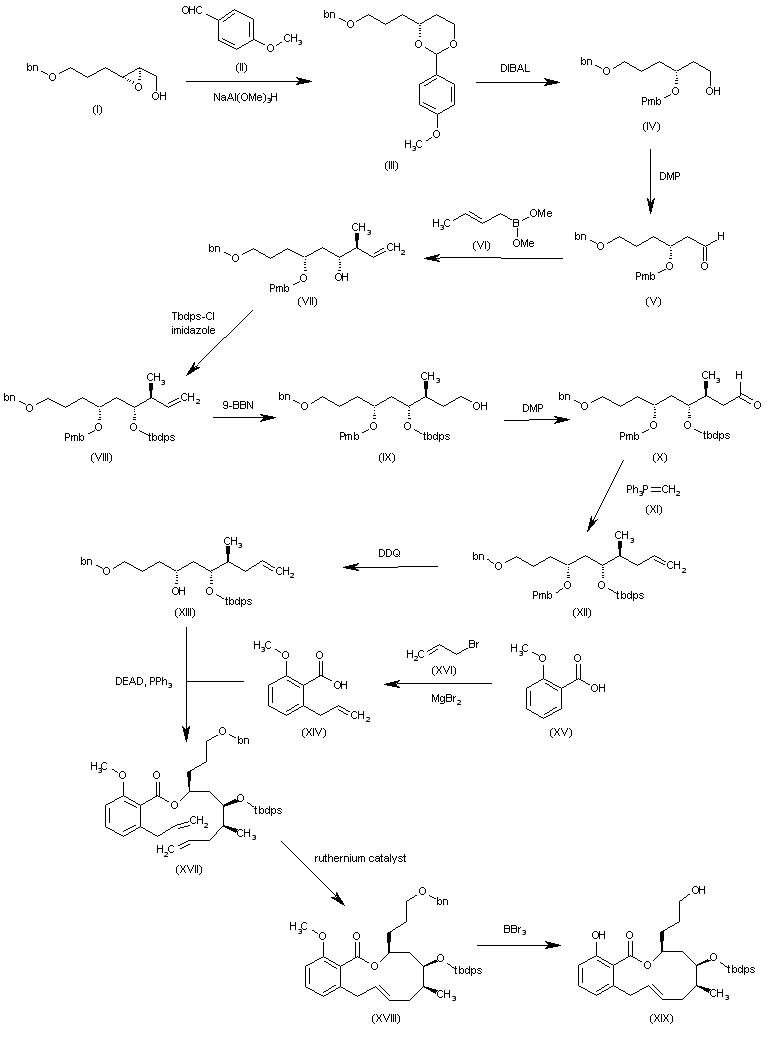 The reaction of the chiral epoxide (I) with 4-methoxybenzaldehyde (II) by means of NaAl(OMe)3H in THF gives the 1,3-dioxane (III), which is opened by reduction with DIBAL in dichloromethane to yield the chiral benzyl ether (IV). The oxidation of the primary alcohol of (IV) with DMP in dichloromethane affords the corresponding aldehyde (V), which is condensed with the boronate (VI) and S,S-diisopropyl tartrate in toluene to provide the unsaturated alcohol (VII).The protection of (VII) with Tbdps-Cl and imidazole yields the fully protected triol (VIII), which is oxidized at the terminal double bond with 9-BBN in THF to give the primary alcohol (IX). The oxidation of (IX) with DMP in dichloromethane affords the aldehyde (X), which is condensed with methylenetriphenylphosphorane (XI) in THF to provide the terminal olefin (XII). Elimination of the Pmb protecting group of (XII) with DDQ in dichloromethane gives the alcohol (XIII), which is esterified with 2-allyl-6-methoxybenzoic acid (XIV)(obtained by allylation of 2-methoxybenzoic acid (XV) with allyl bromide (XVI), BuLi and MgBr2) by means of DEAD and PPh3 yielding the ester (XVII). The cyclization of (XVII) by means of a metathesis reaction catalyzed by a ruthenium catalyst in refluxing dichloromethane affords the bicyclic lactone (XVIII), which is treated with BBr3 in dichloromethane to provide the dihydroxylated lactone (XIX).