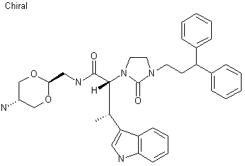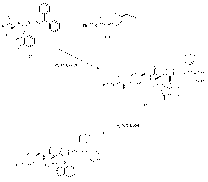 Treatment of (Boc)-beta-methyltryptophan (I) with SOCl2 and MeOH produced beta-methyltryptophan methyl ester (II). 3,3-Diphenylpropylamine (III) was protected with Boc2O and then alkylated with allyl bromide in the presence of potassium hexamethyldisilazide to afford (IV). Further ozonization of the allyl double bond of (IV) generated the aminoaldehyde (V). Amino ester (II) was reductively alkylated with aldehyde (V) in the presence of NaBH3CN to yield the protected diamine (VI). After acid deprotection of the Boc group of (VI), the resulting diamine (VII) was converted to imidazolinone (VIII) upon treatment with phosgene and diisopropylethylamine. Subsequent hydrolysis of the methyl ester of (VIII) gave carboxylic acid (IX).