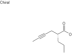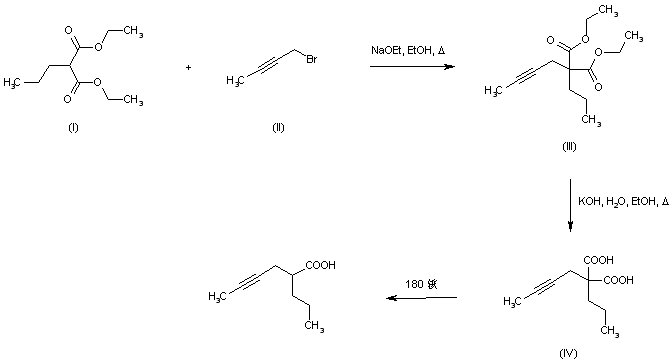 The alkylation of diethyl n-propylmalonate (I) with 1-bromo-2-butyne (II) in the presence of ethanolic NaOEt afforded the dialkyl malonate (III). Subsequent saponification of the ethyl esters of (III) with KOH gave the corresponding malonic acid (IV), which was decarboxylated at 180 C to yield the title compound.
