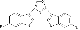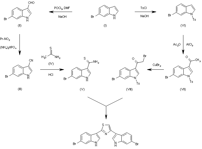 By cyclization of 6-bromo-1H-indole-3-carbothioamide (V) with 6-bromo-3-(2-bromoacetyl)-1-tosyl-1H-indole (VIII) in refluxing ethanol, followed by elimina-tion of the tosyl protecting group with NaOH in refluxing methanol. The intermediates 6-bromo-1H-indole-3-carbothioamide (V) and 6-bromo-3-(2-bromoacetyl)-1-tosyl-1H-indole (VIII) have been obtained as follows: 6-Bromo-1H-indole-3-carbothioamide (V): The reaction of 6-bromoindole (I) with POCl3 and DMF, followed by hydrolysis with NaOH in refluxing water gives 6-bomoindole-3-carbaldehyde (II), which is treated with propyl nitrite and diammonium phosphate in refluxing acetic acid to yield the nitrile (III). Finally, the reaction of (III) with thioacetamide and HCl in refluxing DMF affords the interme-diate carbothioamide (V). 6-Bromo-3-(2-bromoacetyl)-1-tosyl-1H-indole (VIII): The protection of 6-bromoindole (I) with tosyl chloride and NaOH in toluene/water gives the 6-bromo-1-tosylindole (VI), which is acetylated with acetic anhydride and AlCl3 in dichloro-methane yielding the 3-acetyl derivative (VII). Finally, the bromination of (VII) with CuBr2 in refluxing ethyl acetate/chloroform affords the target 3-(bromoacetyl) derivative (VIII).