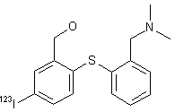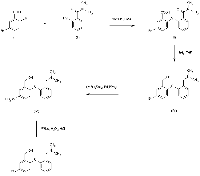 Coupling of 2,5-dibromobenzoic acid (I) with 2-sulfanyl-N,N-dimethylbenzamide (II) in the presence of sodium methoxide provided diaryl sulfide (III). Reduction of carboxylate and amide functions of (II) by means of borane in THF produced aminoalcohol (IV). Subsequent reaction of (IV) with bis(tributyltin) employing a palladium(0) catalyst gave the tributylstannyl derivative (IV). This was finally converted to the radioiodinated compound upon reaction with [123I] sodium iodide and hydrogen peroxide.