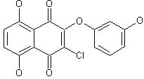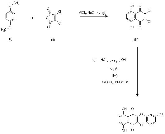 Friedel Crafts condensation of p-dimethoxybenzene (I) with dichloromaleic anhydride (II) in a molten mixture of AlCl3 and NaCl yielded dichloronaphthazarin (III). Finally, treatment of (III) with resorcinol (IV) and Na2CO3 in DMSO at room temperature furnished the target compound.