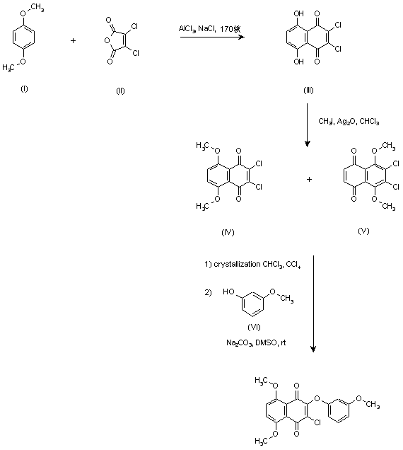 Friedel Crafts condensation of p-dimethoxybenzene (I) with dichloromaleic anhydride (II) in a molten mixture of AlCl3 and NaCl yielded dichloronaphthazarin (III). Subsequent methylation of (III) with CH3I in the presence of Ag2O in CHCl3 gave a mixture of dimethoxy naphthoquinones (IV) and (V), from which the desired isomer (IV) was isolated by recrystallization from CHCl3-CCl4. Finally, treatment of (IV) with 3-methoxyphenol (VI) and Na2CO3 in DMSO at room temperature furnished the target compound.